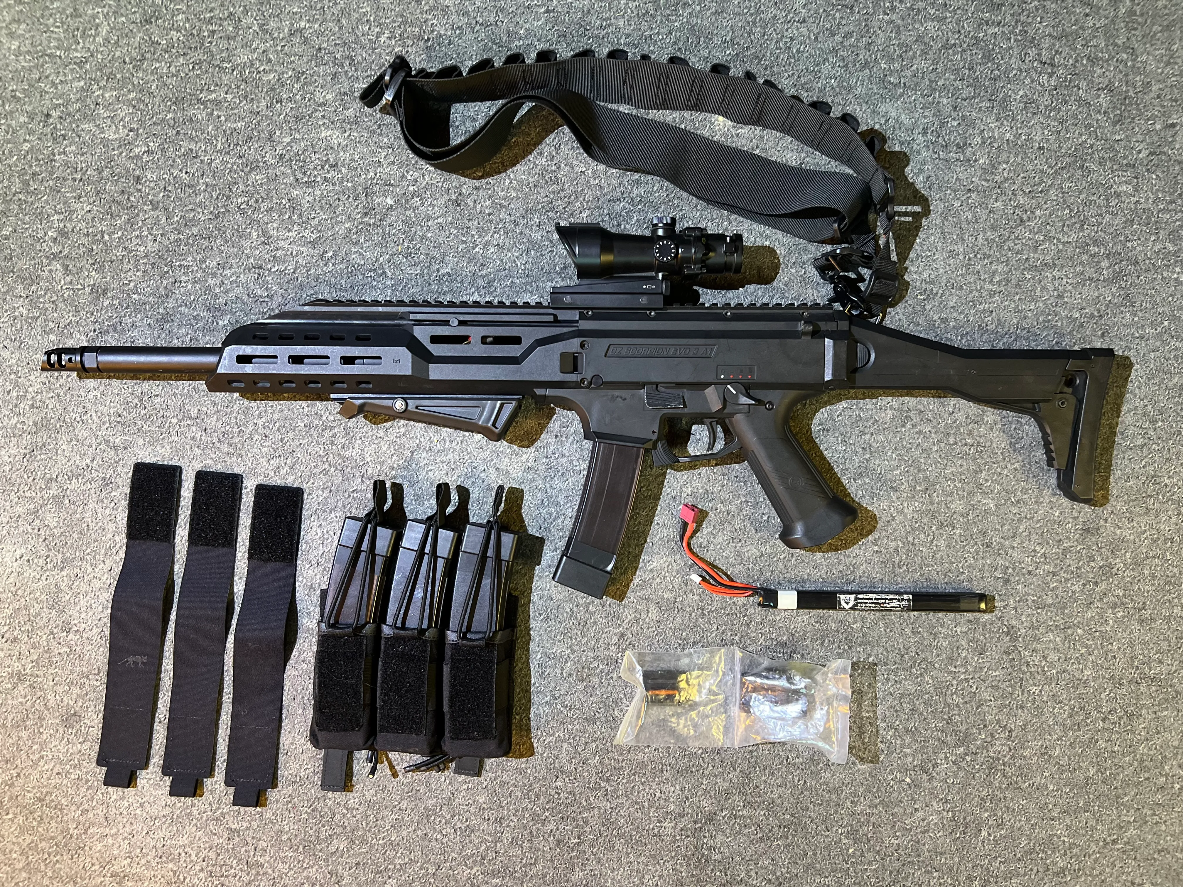Je mets en vente une réplique airsoft Scorpion EVO3 A1 version carabine, en très bon état de fonctionnement. La réplique est parfaitement fonctionnelle, bien entretenue, avec seulement quelques légères traces d’utilisation normales qui n’affectent en rien les performances. Avec boîte d’origine. Le lot comprend : ≈ 690€ – Scorpion EVO3 A1 carabine 440€ – 1 batterie 25€ – 1 viseur 85€ – 1 poignée avant 13€ – 3 chargeurs supplémentaires 75€ – 1 porte-chargeur 25€ – 1 sangle 16€ – Ressort supplémentaire M90 (350fps) 10€ Ensemble complet, prêt à jouer immédiatement. Vente pour manque de temps pour pratiquer. Photos supplémentaires possibles sur demande. Remise en main propre ou envoi possible selon accord.